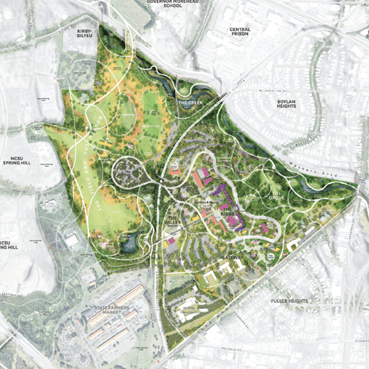 Right now, the project is in the planning stages of implementing Phase 1. In Phase 1 developers will create a land bridge over Western Boulevard, build the plaza and play area, enhance Rocky Brand Creek and restore the historic entry and buildings. Check out the full implementation plan.