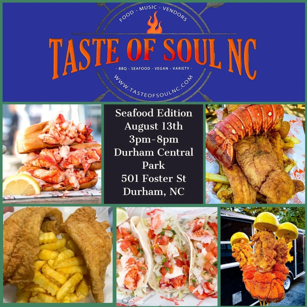 Enjoy Seafood, BBQ, Burgers and more at the Seafood Edition of Taste of Soul NC. There will also be other vendors and activities.